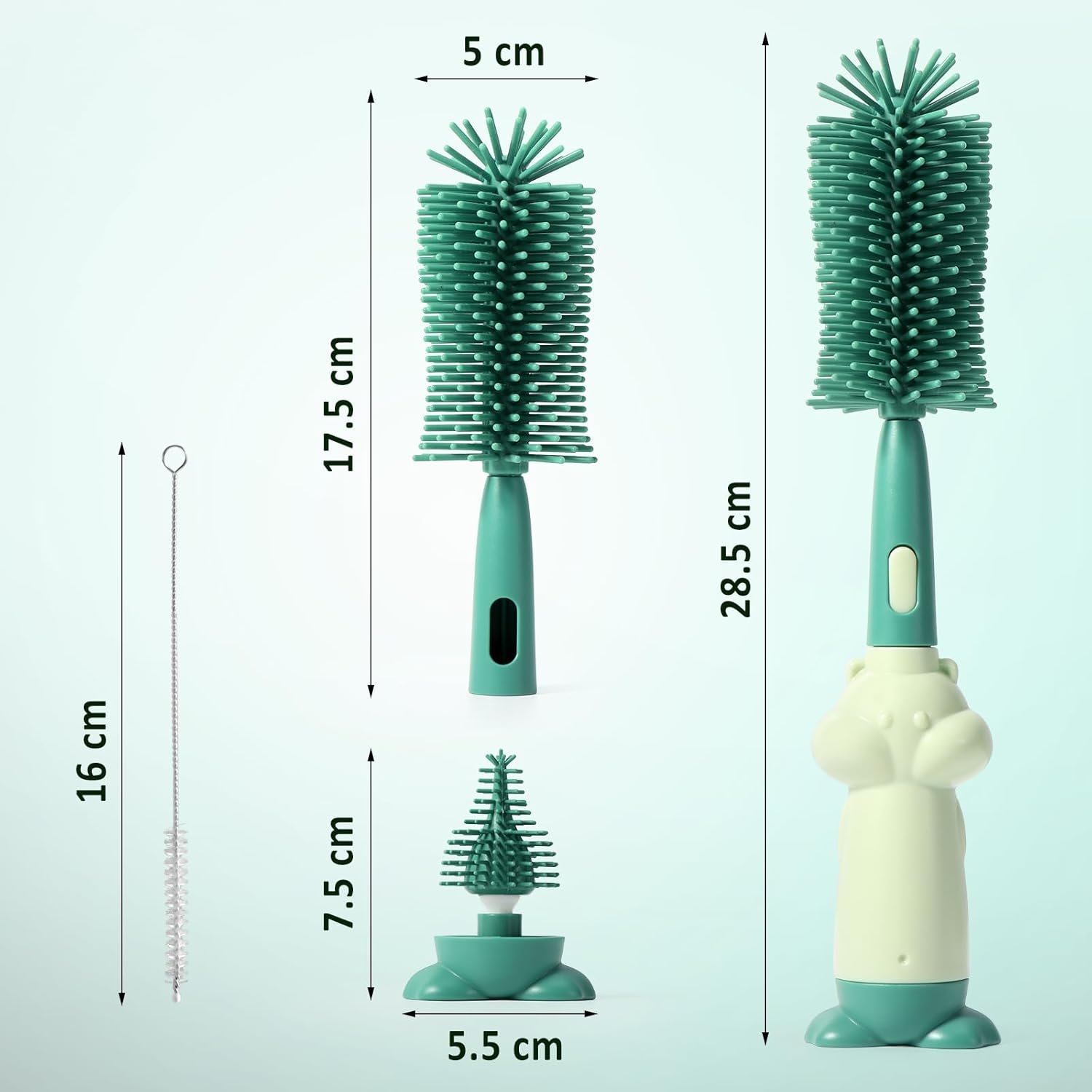 Combines a bottle brush, nipple brush, and straw brush into one compact set, reducing the need for multiple cleaning tools. -