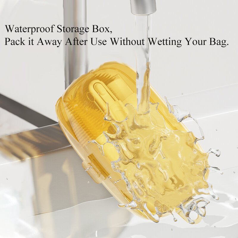A complete silicone brush set with a handy storage box, including brushes for bottles, nipples, straws, and a 30ml dispenser bottle—perfect for organized, on-the-go cleaning.